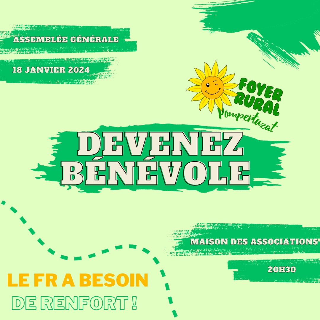 Appel aux bénévoles pour le Foyer Rural, rendez-vous lors de l’Assemblée Générale le 18 janvier 2024 à 20h30 à la maison des associations.
