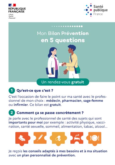 Mon bilan prévention, c’est un nouveau rendez-vous gratuit avec un médecin, un pharmacien, un infirmier ou une sage-femme pour parler de sa santé et avoir des conseils personnalisés de prévention. Les bilans de prévention sont destinés à toutes les personnes à des âges clés de la vie, c’est-à-dire entre : 18 et 25 ans ; 45 et 50 ans ; 60 et 65 ans ; 70 et 75 ans.