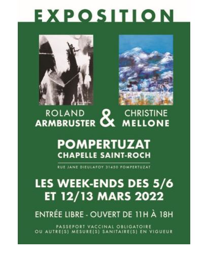 Exposition Chapelle Saint Roch POMPERTUZAT Exposition Chapelle Saint ROCH Christine MELLONE et Roland ARMBRUSTER  Seront heureux de vous recevoir tout au long de l’exposition et vous invitent au vernissage le Samedi 12 mars à partir de 17h30 Mairie de...