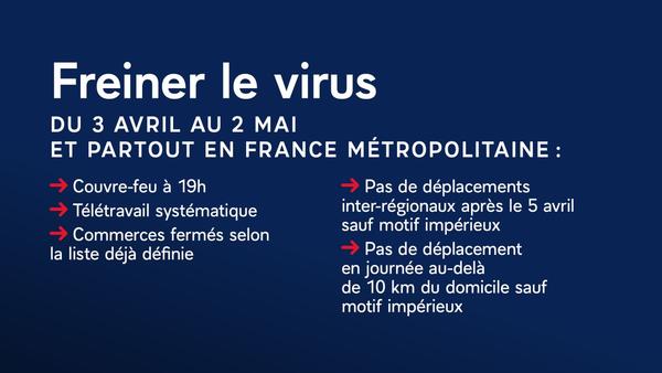 Face à la propagation d’un variant plus dangereux et plus meurtrier du virus sur l’ensemble du territoire métropolitain, le président de la République a annoncé l’extension des règles qui étaient jusqu’alors en vigueur dans 19 départements à tout le territoire métropolitain dès ce samedi soir à 19 h et pour 4 semaines jusqu’au 3 mai, à savoir :