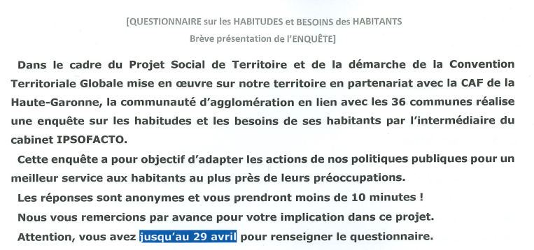Lien direct vers le questionnaire, vous pouvez y répondre avant le 29 avril 2024.