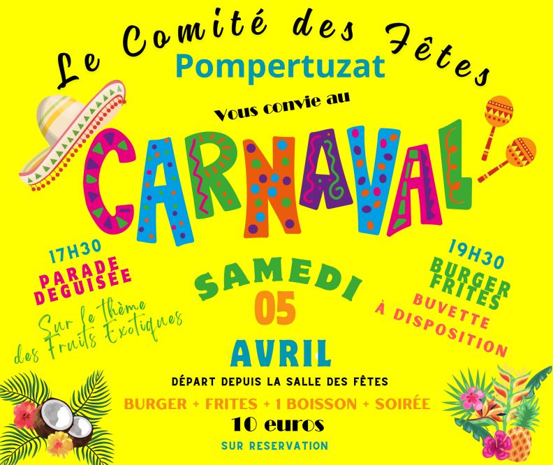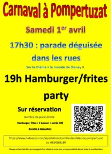 19h30 : hamburger / frites party sur réservation : https://www.helloasso.com/associations/comite-des-fetes-de-pompertuzat/evenements/carnaval-de-pompertuzat