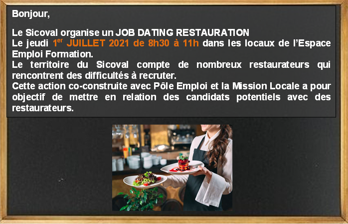 Le Sicoval organise un Job Dating Restauration le jeudi 1er juillet 2021 de  8 h 30 à 11 h dans les locaux de l’Espace Emploi Formation.