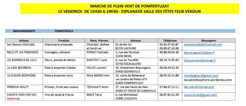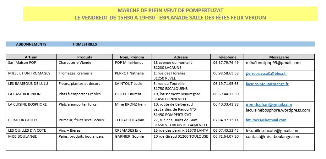 Si vous voulez contacter les commerçants présents vous trouverez ci-dessous leurs coordonnées.