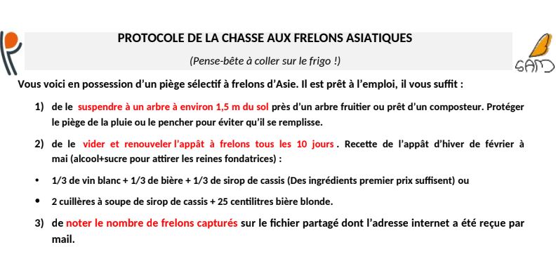 Suite au rendez-vous VENDREDI 14 MARS à 19h en Mairie en présence de Messieurs LOYER et MALLET, apiculteurs, veuillez trouver ici les bonnes pratiques pour le plan de piégeage.