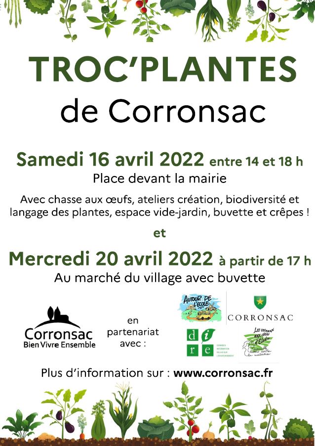 L’Association Corronsac, Bien Vivre Ensemble organise le deuxième TROC’PLANTES de Corronsac qui aura lieu le samedi 16 avril 2022 entre 14 h et 18 h place de la mairie et le mercredi 20 avril 2022 à partir de 17 h au marché du village.